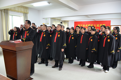 ????“我是中华人民共和国法官,我宣誓:忠于中华人民共和国宪法,维护宪法权威,履行法定职责,忠于祖国,忠于人民,恪尽职守、廉洁奉公,接受人民监督,为建设富强、民主、文明、和谐的社会主义国家努力奋斗。”当天下午14时30分,严肃的誓词宣读声在武鸣区法院响起,虽然誓词只有短短81个字,却集中展现了我院审判人员对宪法精神、宪法权威、宪法尊严的崇高信念,展示了法院审判人员履行法官职责,切实维护社会公平正义的庄严承诺。