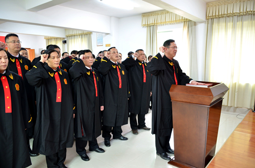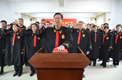 ????2月23日下午,我院举行首批入额法官宣誓活动,院党组书记、院长傅豪手抚宪法,带领35名入额法官身着法袍,右手握拳,面向国旗宣读誓词,作出了一名人民法官的庄严承诺。